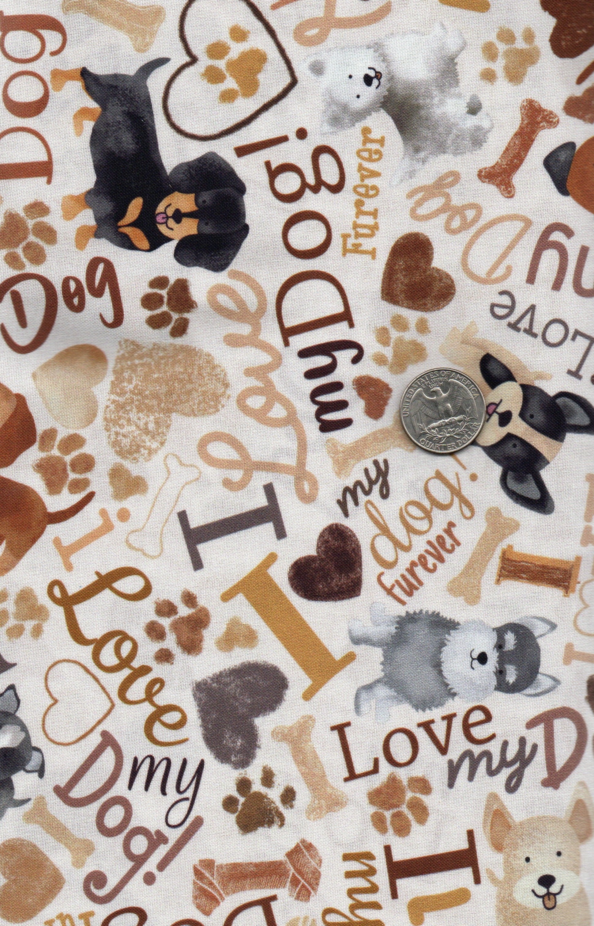 A variety of dogs and phrases on cream background